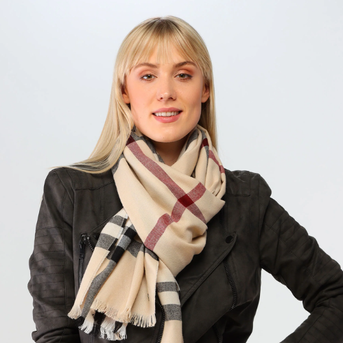 Long woven scarf featuring striking plaid pattern